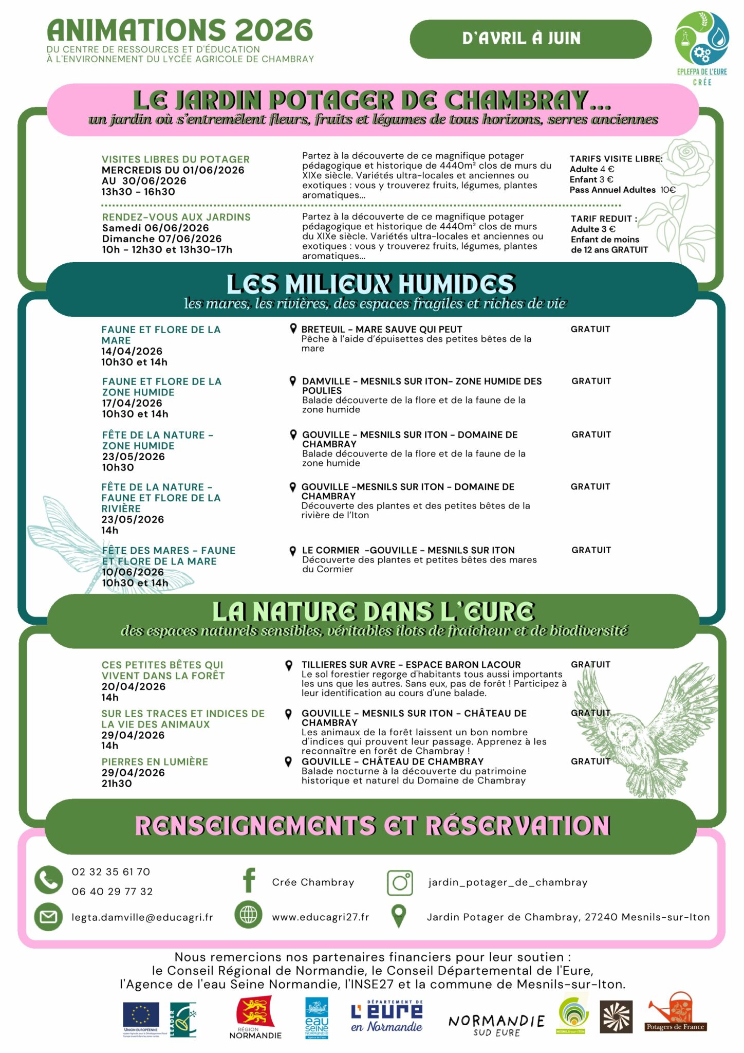 Fort de la diversité des milieux naturels et de la richesse patrimoniale du Domaine de Chambray et du territoire, le CRÉE développe des activités d’animation et de formation pour différents publics et dans plusieurs domaines: